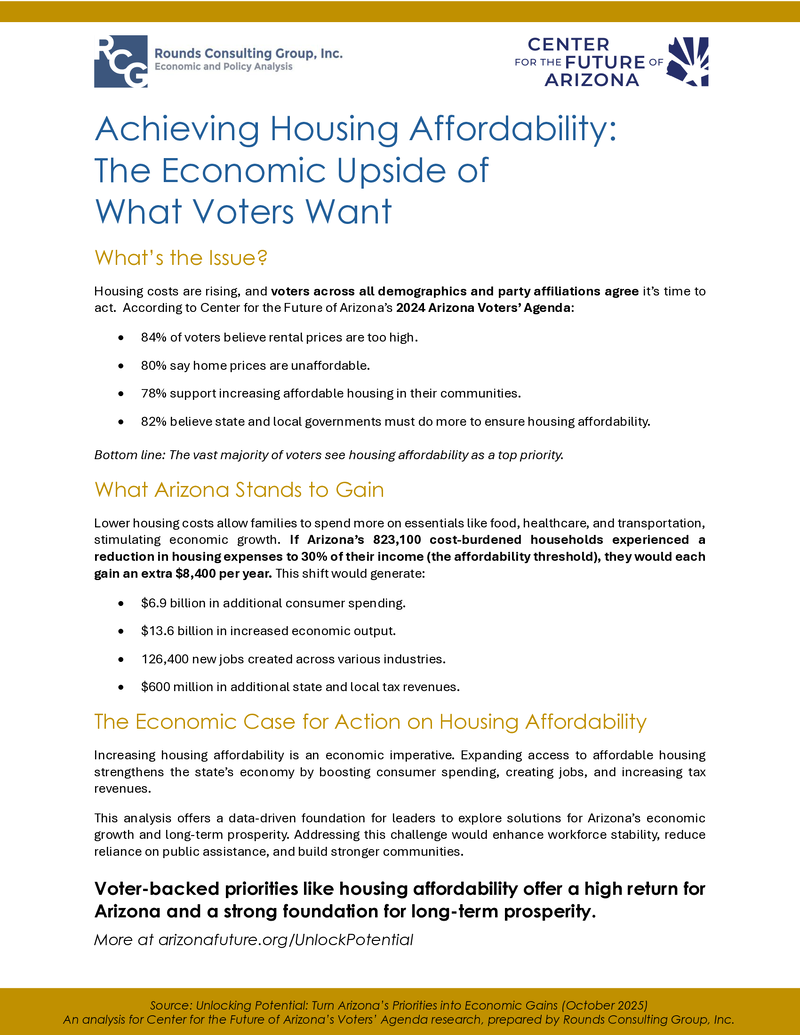 A summary of key findings from Unlocking Potential, economic analysis of priorities identified through the Arizona Voters’ Agenda, showing the potential economic impact of investing in housing.